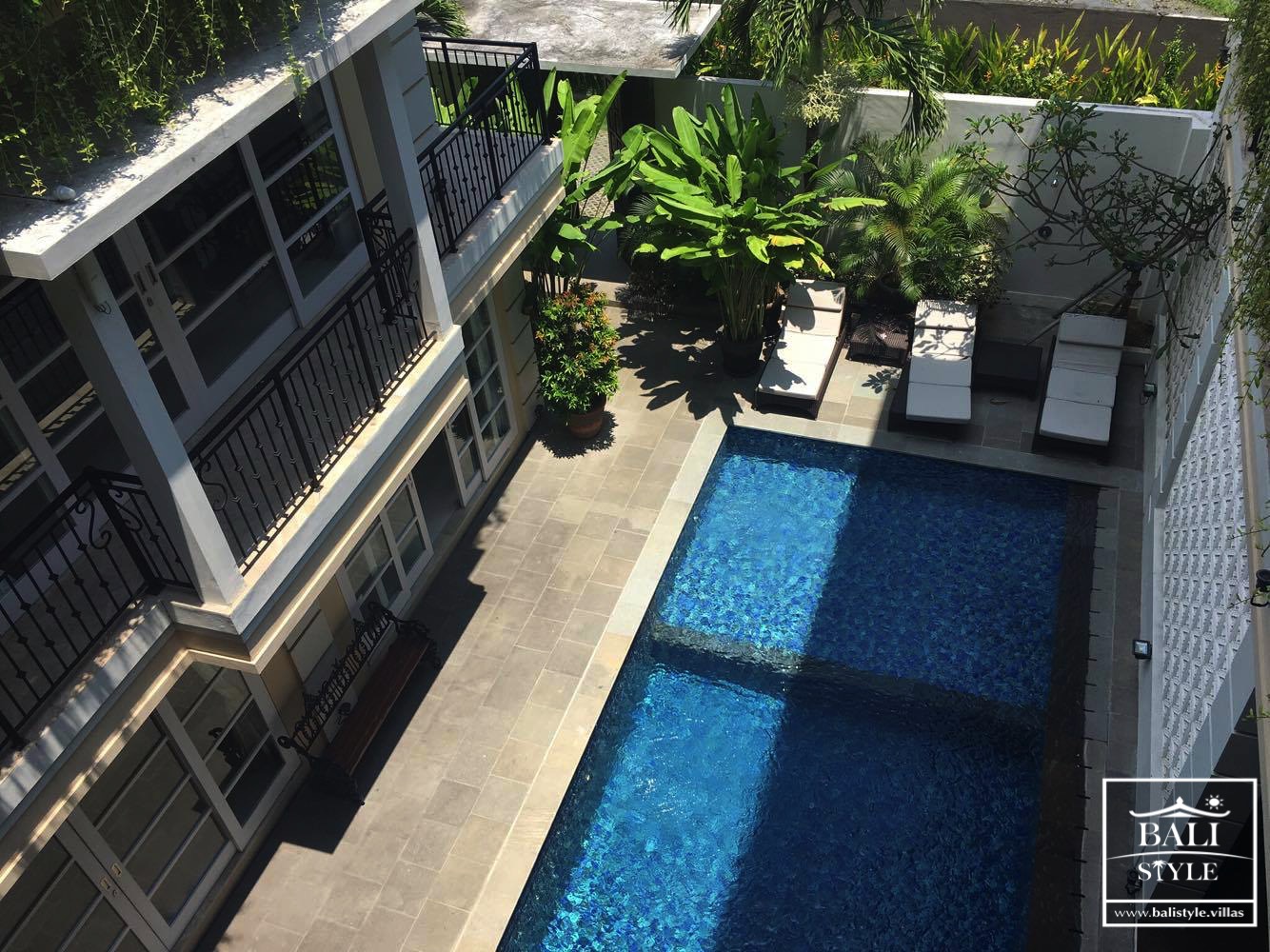 Вилла представляет собой монументальный аристократический особняк, построенный в классическом архитектурном решении для античных вилл, в виде литеры П, в центре внутреннего двора располагается приватный плавательный бассейн по по периметру элегантно декорированный тропическими растениями в вазонах и кованой лавкой. С одной стороны к бассейну выходит просторная гостиная, с другой – обеденный зал. С противоположенной стороны бассейна установлены лежаки.